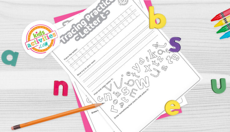 Tracing practice for uppercase and lowercase letter T printable worksheets - printed pdf shown on dark background with alphabet letters and pencil - Kids Activities Blog