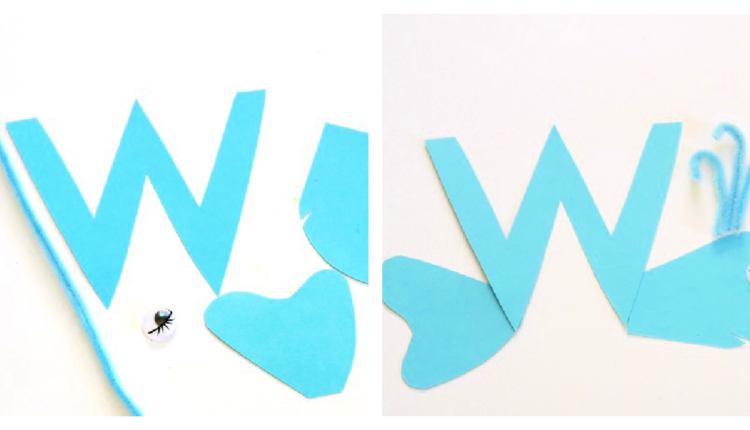 - For the face: Glue the googly eyes to the pinnacle of the letter W whale.