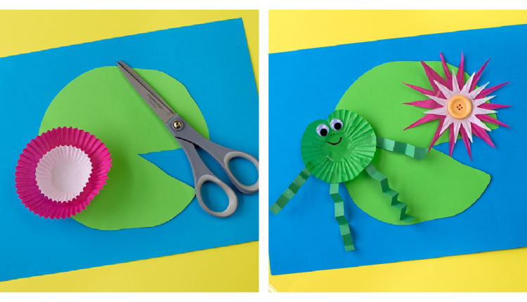 Minimize skinny strips of inexperienced paper, then fold it accordion model. Glue the paper strips to the again of the cupcake liner. Glue the frog and flower to the lily pad.