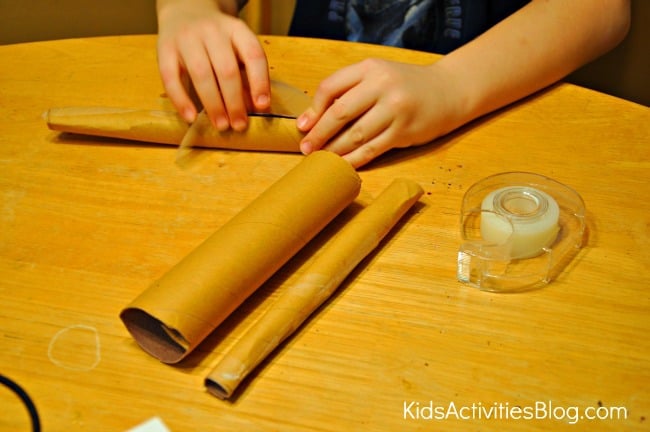 - 3 cardboard tubes: paper towel rolls, wrapping paper rolls, spool rolls or rolled up cardboard – finest if one is bigger in diameter than the opposite 2