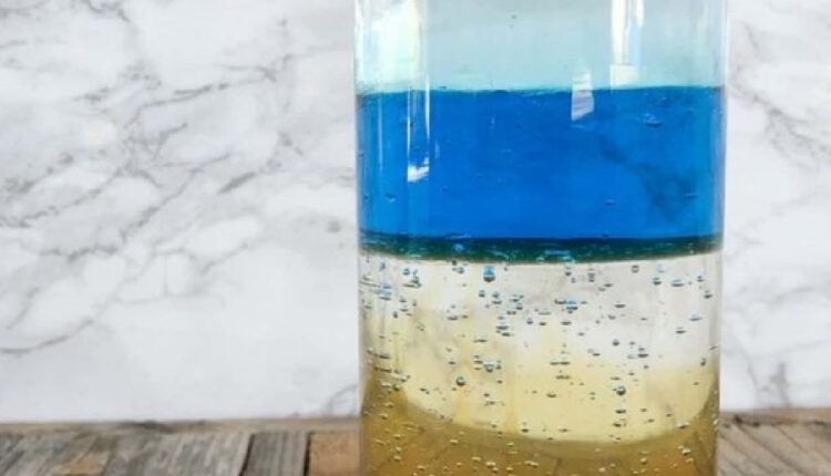 - We’re going to layer the liquids within the clear jar with the heaviest and thickest on the underside and including till we’ve all our liquids. Pour the liquids in rigorously on this order: honey, corn syrup, dish cleaning soap, water, vegetable oil