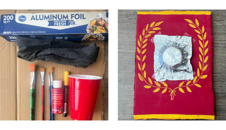 Supplies needed for Roman Shield Craft cardboard, tin foil, fabric, paint brushes, yellow paint marker, red paint, red solo cup-Kids Activities Blog