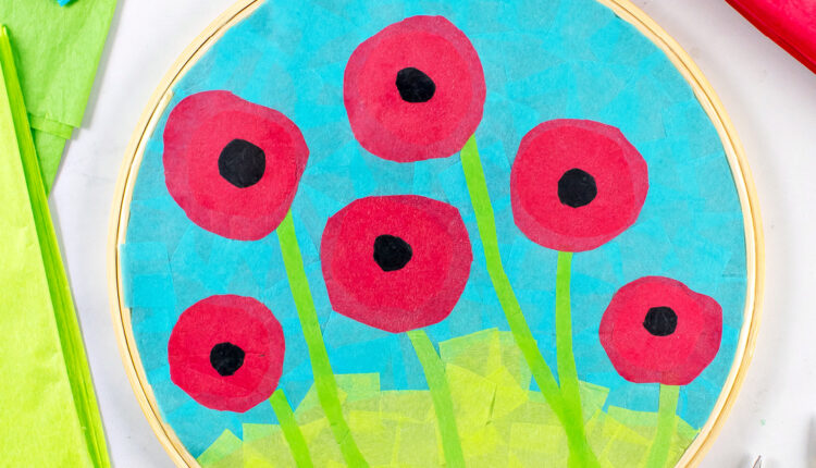 We’re going to wrap contact paper round an embroidery hoop. Then we’ll connect tissue paper to the sticky facet to make our fairly poppies craft.