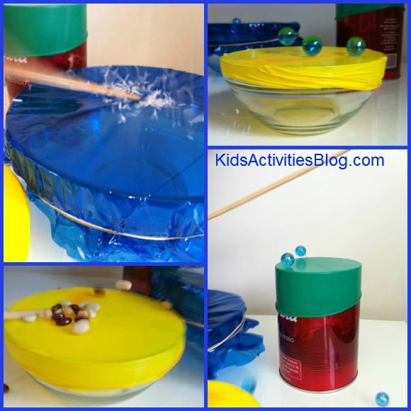 How sound is made collage- hitting drum with rice on it, marbles, beans, and beads on bowls and cans- kids activities blog