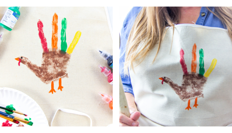 Let’s make lovely Thanksgiving aprons with handprint turkeys on them!