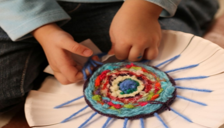 - Alternating totally different colours and textures of yarn, weave across the paper plate loom.